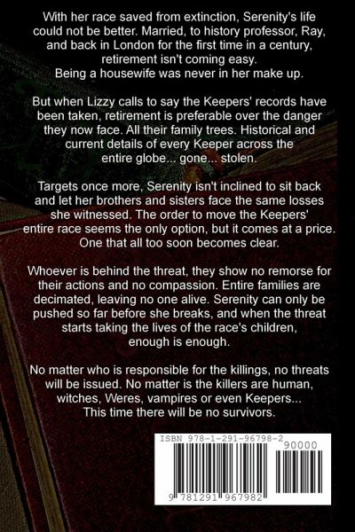 With her race saved from extinction, Serenity's life could not be better. Married, finally, to history professor, Ray, and back in London for the first time in a century, retirement isn't coming easy. Being a housewife was never in her make up. But when Lizzy calls to say the Keepers' records have been taken, retirement is preferable over the danger they now face. All their family trees. Historical and current details of every Keeper across the entire globe... gone... stolen. Targets once more, Serenity's isn't inclined to sit back and let her brothers and sisters face the losses she witnessed. No matter who is behind the threat, they will not face the endless mercy the Keepers have always displayed. No matter who is responsible for the killings, no threats will be issued. No matter if the killers are human, witches, Weres, vampires or even Keepers... This time, there will be no survivors.