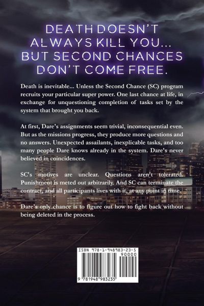 Not even death can kill you... Dare should be dead. You don't get hit by a high voltage power line in a freak accident and live. Unless the Second Chance program wants you for its own ends, that is. A second life, one last chance, but at the cost of serving an aeons old system that protects humanity... even from itself. The tasks Dare is assigned seem harmless at first, but as the missions progress, things seem off. There are creatures the system can't see, plans that go awry. Too many people Dare knows are involved already, a coincidence Dare can't help but wonder at. The system's motives are unclear, it doesn't like to be questioned, and it won't tolerate being disobeyed. SC can terminate the contract, and Dare's life with it, at its discretion. Dare's only chance is to follow where the tasks lead, no matter the cost.