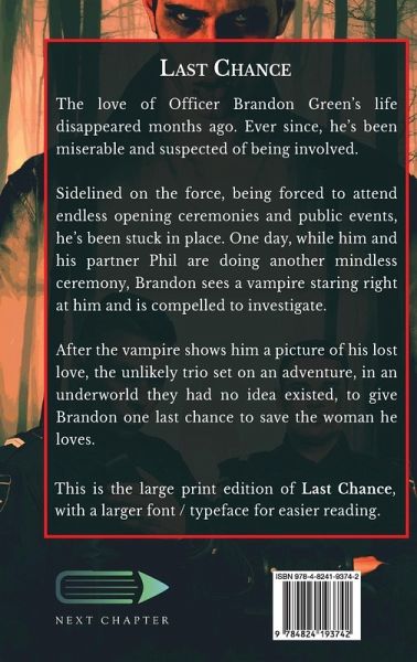 The love of Officer Brandon Green's life disappeared months ago. Ever since, he's been miserable and suspected of being involved. Sidelined on the force, being forced to attend endless opening ceremonies and public events, he's been stuck in place. One day, while him and his partner Phil are doing another mindless ceremony, Brandon sees a vampire staring right at him and is compelled to investigate. After the vampire shows him a picture of his lost love, the unlikely trio set on an adventure, in an underworld they had no idea existed, to give Brandon one last chance to save the woman he loves. This is the large print edition of Last Chance, with a larger font / typeface for easier reading.