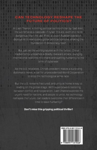 Can technology reshape the future of politics? In Last Chance, a thrilling political techno-thriller by Gad Amit, the world faces a cascade of cyber threats, each one more dangerous than the last. First, a covert Russian operation deploys AI to manipulate global political opinions, shaking the foundation of democracy itself. But just as the world grapples with the fallout, China inadvertently unleashes a deadly malware attack, plunging international relations into chaos and pushing humanity to the brink of cyberwar. As the U.S. retaliates, China's president makes a surprising diplomatic move, a call for unprecedented World Cooperation to stop the technological arms race. But the U.S. remains fractured, and unity at home is key to leading on the global stage. With superpowers teetering between conflict and cooperation, Last Chance explores the urgent need for nations, and people to unite. As technology reshapes the future, can leaders overcome their differences in time to save humanity? Don't miss this gripping political thriller!