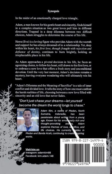 A. Kim is an author who has long immersed himself in the world of literature, creating works that are both heart-stirring and emotionally rich. With a distinctive writing style and an ability to portray deep internal conflicts, A. Kim has successfully crafted stories that not only entertain but also inspire readers to reflect on the meaning of love, sacrifice, and life choices. Born and raised in a small town in Medan (North Sumatera) - Indonesia, A. Kim developed an interest in writing at a young age. He discovered the power of words and began writing short stories, poems, and essays that expressed his views on life. After completing his education at a private university in Medan, A. Kim continued to pursue his dream by writing novels filled with profound meaning. His works often highlight the emotional dilemmas faced by his characters, taking readers on journeys full of surprises and self-discovery. His latest Tetralogy, titled "ADAM" (Part I, Part II, Part III, and Last Chapter), showcases A. Kim's expertise in weaving complex and challenging love stories. In addition to writing, A. Kim is also active in the literary community, frequently sharing his insights and experiences with aspiring writers. A. Kim currently resides in Medan and Banda Aceh, where he continues to write and create new, inspiring works.
