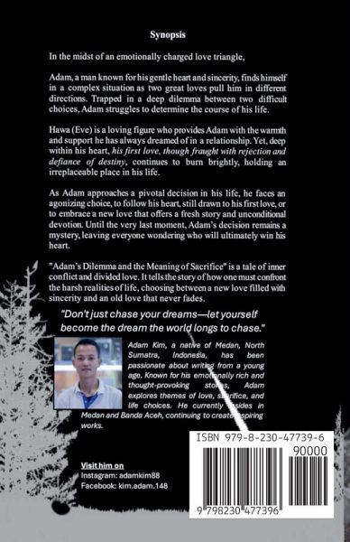 In the whirlwind of a gripping love triangle, Adam, a man with a gentle and sincere heart, finds himself at a life-altering crossroads. Two great loves, pulling in opposite directions, drag him into a deep and suffocating dilemma. Hawa (Eve), a loving woman who has always provided him with the warmth and support he longed for, offers a future filled with hope and unconditional love. Yet, the shadows of the past continue to haunt him-N.J. Eliot, his first love, marked by pain and rejection, still holds an irreplaceable place in his heart, untouched by time. As Adam faces a decision that will shape his future, the story becomes even more complicated when Hawa (Eve) begins to feel something unexpected-her heart slowly connects with N.J. Eliot. Now, Adam is not only torn between old and new loves, but he also faces the possibility of being left behind by both Hawa (Eve) and N.J. Eliot, who might find happiness together without him. "Adam's Dilemma, Hawa (Eve), N.J. Eliot, and the Meaning of Sacrifice" is a tale of divided love, inevitable sacrifice, and difficult choices. Who will win whose heart? Will Adam find his way to happiness, or will he be left in solitude? With every choice made, the fate of this love triangle grows more complex, leaving readers on edge and eager to turn the next page until the very end.