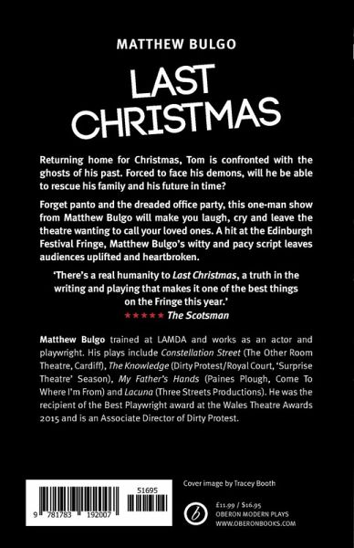 Matthew Bulgo's debut full-length play, Last Christmas was produced in 2012 to critical acclaim by Clwyd Theatr Cymru and Dirty Protest, and was nominated in the Best Production category at the inaugural "Theatre Critics in Wales Awards". Marking its London premiere at Soho Theatre in December 2014, the script is revised for publication with Oberon Books. Stuck in the city, in a life he hates, Tom is to return home for Christmas and be confronted with his past. Forced to face his demons, loss and the unstoppability of time, he attempts to rescue his family and his future. Will Tom be able to save it all in time?