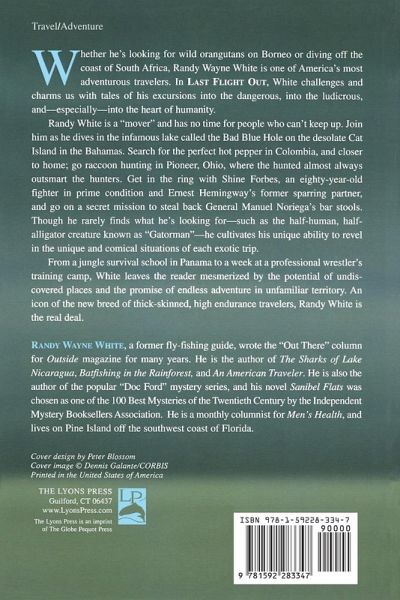 Whether he's looking for wild orangutans on Borneo or diving off the coast of South Africa, Randy Wayne White is one of America's most adventurous travelers. Now Randy's back in Last Flight Out, a brand-new collection of essays keeping us up to date on his latest excursions. Randy White is a "mover" and has no time for people who can't keep up. Join him as he dives in the infamous lake called the Bad Blue Hole on the desolate Cat Island in the Bahamas. Search for the perfect hot pepper in Colombia, and closer to home, go raccoon hunting in Pioneer, Ohio, where the hunted almost always outsmart the hunters. Get in the ring with Shine Forbes, an eighty-year-old fighter in prime condition and Ernest Hemingway's former sparring partner, and go on a secret mission to steal back General Manuel Noriega's bar stools. Though he rarely finds what he's looking for-such as the half-human, half- alligator creature known as "Gatorman"-he cultivates his unique ability to revel in the unique and comical situations of each exotic trip. From a jungle survival school in Panama to a week at a professional wrestler's training camp, White leaves the reader mesmerized by the potential of undiscovered places and the promise of endless adventure in unfamiliar territory. An icon of the new breed of thick-skinned, high endurance travelers, Randy White is the real deal.