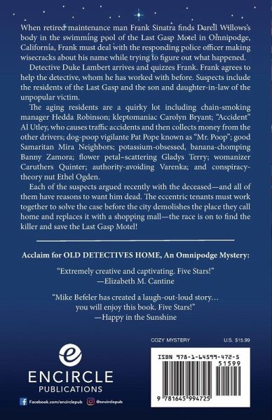 When retired maintenance man Frank Sinatra finds Darell Willows's body in the swimming pool of the Last Gasp Motel in Omnipodge, California, Frank must deal with the responding police officer making wisecracks about his name while trying to figure out what happened. Detective Duke Lambert arrives and quizzes Frank. Frank agrees to help the detective, whom he has worked with before. Suspects include the residents of the Last Gasp and the son and daughter-in-law of the unpopular victim. The aging residents are a quirky lot including chain-smoking manager Hedda Robinson; kleptomaniac Carolyn…mehr