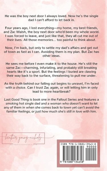 He was the boy next door that I loved. Now he's the single dad I refuse to let back in. My ex-best friends have been dead to me for four years. I left against my will and then... they stopped talking to me. An entire lifetime of childhood friendships flushed down the drain. Worse yet... I'd been in love with Zac Walsh-the literal boy next door who went through women the way most of us went through underwear-since I was thirteen. Then... he just stopped being my best friend and so did the rest of them. Unfortunately, coming back to town isn't my idea. But it's my responsibility to take care of my dad's things and I'm determined to do the job then get out of here as quickly as possible. Maybe without seeing any of them. Of course, that doesn't happen. Zac sees me before I get into the house. He's still the boy next door, probably still going through women like most of us go through underwear, and against my better judgment, those feelings bubble up from the deep abyss I'd exiled them to. As the secrets that have been hidden from me all start finding their way to the surface, is he really the only one I can lean on? Last Good Thing is book one in the Fallout Series and features a smoking hot single dad and a woman who doesn't want to let any of them in when she comes back to town yet can't avoid the familiar feelings, or just how much she's still in love with him.