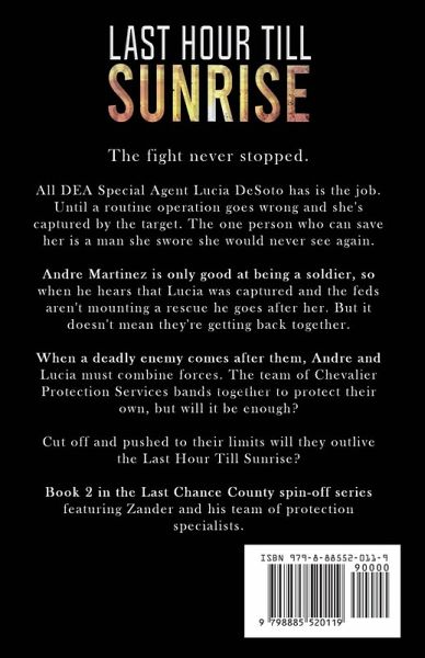 The fight never stopped. All DEA Special Agent Lucia DeSoto has is the job. Until a routine operation goes wrong and she's captured by the target. The one person who can save her is a man she swore she would never see again. Andre Martinez is only good at being a soldier. When he hears Lucia was betrayed, and the feds aren't mounting a rescue, he goes after her personally. But it doesn't mean they're getting back together. When a deadly enemy comes after them, Andre and Lucia must combine forces. The team of Chevalier Protection Services bands together to protect their own, but will it be enough to stop a deadly attack? Cut off and pushed to their limits will they outlive the Last Hour Till Sunrise? Book 2 in the Last Chance County spin-off series featuring Zander and his team of protection specialists. **Christian romantic suspense** Book 1 Last Taste of Freedom Book 2 Last Hour till Sunrise Book 3 Last One still Standing Book 4 Last Man to Survive Book 5 Last Line of Defense¿