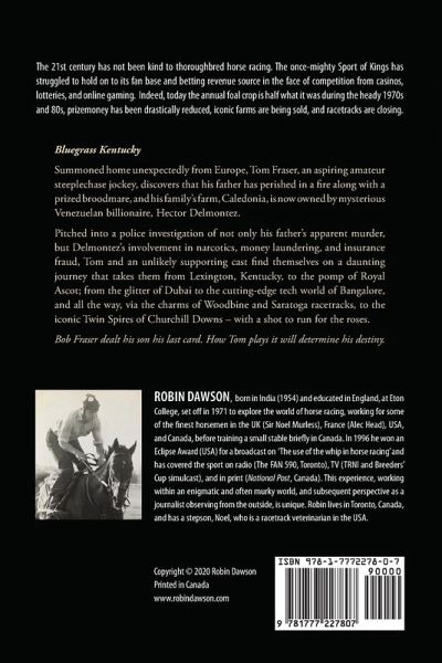 The 21st century has not been kind to thoroughbred horse racing. The once-mighty Sport of Kings has struggled to hold on to its fan base and betting revenue source in the face of competition from casinos, lotteries, and online gaming. Indeed, today the annual foal crop is half what it was during the heady 1970s and 80s, prizemoney has been drastically reduced, iconic farms are being sold, and racetracks are closing... ¿Bluegrass Kentucky Summoned home unexpectedly from Europe, Tom Fraser, an aspiring amateur steeplechase jockey, discovers that his father has perished in a fire along with a prized broodmare, and his family's farm, Caledonia, is now owned by mysterious Venezuelan billionaire, Hector Delmontez. Pitched into a police investigation of not only his father's apparent murder, but Delmontez's involvement in narcotics, money laundering, and insurance fraud, Tom and an unlikely supporting cast find themselves on a daunting journey that takes them from Lexington, Kentucky, to the pomp of Royal Ascot; from the glitter of Dubai to the cutting-edge tech world of Bangalore, and all the way, via the charms of Woodbine and Saratoga racetracks, to the iconic Twin Spires of Churchill Downs - with a shot to run for the roses. Bob Fraser dealt his son his last card. How Tom plays it will determine his destiny.