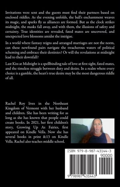 Invitations were sent and the guests must find their partners based on enclosed riddles. As the evening unfolds, the ball's enchantment weaves its magic, and sparks fly as alliances are formed. But as the clock strikes midnight, the masks fall away, and with them, the illusions of safety and certainty. True identities are revealed, fated mates are uncovered, and unexpected love blossoms amidst the intrigue. In a world where fantasy reigns and arranged marriages are not the norm, can these newfound pairs navigate the treacherous waters of political scheming and embrace their destinies? Or will the revelations at midnight lead to their downfall? Last Kiss at Midnight is a spellbinding tale of love at first sight, fated mates, and the timeless struggle between duty and desire. In a realm where every choice is a gamble, the heart's true desire may be the most dangerous riddle of all.