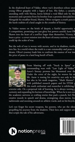In the shadowed heart of Valdor, where war's drumbeat echoes unceasingly, young Oliver grapples with a legacy of loss. His father, a casualty of the unending strife with Hertia, leaves behind a void filled only by the distant memories and a promise from his brother Ivan: a promise shrouded in mystery. Alongside his steadfast friend, Shawn, Oliver navigates a youth punctuated by the harsh realities of a land caught in the crossfire of history. As Valdor teeters on the brink of despair, a fateful opportunity emerges. A competition, promising not just glory but powers untold, lures Oliver and Shawn into the heart of a conflict larger than themselves. Victory, however, bears a price - a covert mission into the heart of enemy territory, a mission that could tip the scales of war. But the web of war is woven with secrets, and in its shadows, truths morph into lies. In a world where the truth is a rare commodity and peace a fleeting dream, Oliver's journey leads him to confront the essence of war itself - and the price of peace in a land long bereft of both.