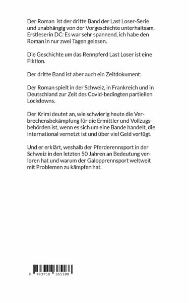Der Roman ist der dritte Band der Last Loser-Serie und unabhängig von der Vorgeschichte unterhaltsam.Erstleserin DC: Es war sehr spannend, ich habe den Roman in nur zwei Tagen gelesen.Die Geschichte um das Rennpferd Last Loser ist eine Fiktion. Der dritte Band ist aber auch ein Zeitdokument: Der Roman spielt in der Schweiz, in Frankreich und in Deutsch-land zur Zeit des Covid-bedingten partiellen Lockdowns. Der Krimi deutet an, wie schwierig heute die Verbrechensbe-kämpfung für die Ermittler und Vollzugsbehörden ist, wenn es sich um eine Bande handelt, die international vernetzt ist und über viel Geld verfügt.Und er erklärt, weshalb der Pferderennsport in der Schweiz in den letzten 50 Jahren an Bedeutung verloren hat und warum der Galopprennsport weltweit mit Problemen zu kämpfen hat.