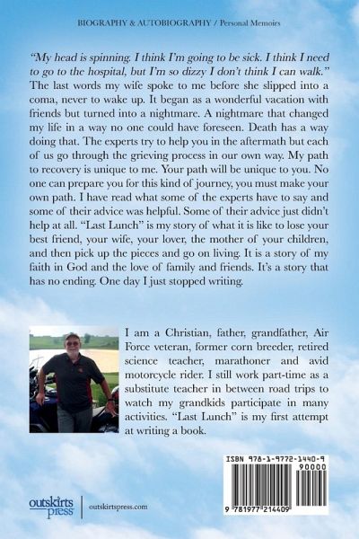 "My head is spinning. I think I'm going to be sick. I think I need to go to the hospital, but I'm so dizzy I don't think I can walk." The last words my wife spoke to me before she slipped into a coma, never to wake up. It began as a wonderful vacation with friends but turned into a nightmare. A nightmare that changed my life in a way no one could have foreseen. Death has a way doing that. The experts try to help you in the aftermath but each of us go through the grieving process in our own way. My path to recovery is unique to me. Your path will be unique to you. No one can prepare you for this kind of journey, you must make your own path. I have read what some of the experts have to say and some of their advice was helpful. Some of their advice just didn't help at all. "Last Lunch" is my story of what it is like to lose your best friend, your wife, your lover, the mother of your children, and then pick up the pieces and go on living. It is a story of my faith in God and the love of family and friends. It's a story that has no ending. One day I just stopped writing.