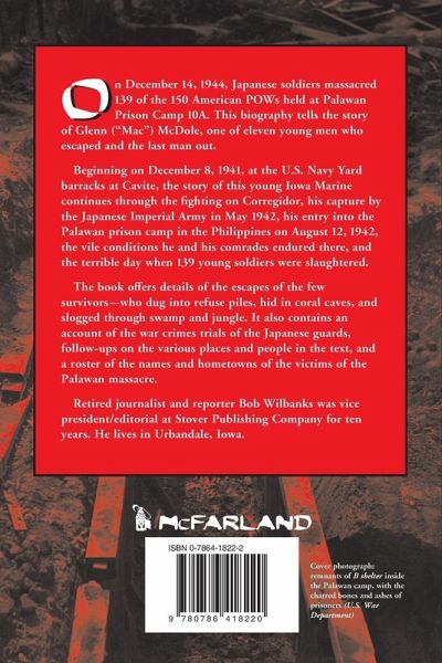 On December 14, 1944, Japanese soldiers massacred 139 of 150 American POWs. This biography tells the story of Glenn ("Mac") McDole, one of eleven young men who escaped and the last man out of Palawan Prison Camp 10A. Beginning on December 8, 1941, at the U.S. Navy Yard barracks at Cavite, the story of this young Iowa Marine continues through the fighting on Corregidor, the capture and imprisonment by the Japanese Imperial Army in May 1942, Mac's entry into the Palawan prison camp in the Philippines on August 12, 1942, the terrible conditions he and his comrades endured in the camps, and the terrible day when 139 young soldiers were slaughtered. The work details the escapes of the few survivors as they dug into refuse piles, hid in coral caves, and slogged through swamp and jungle to get to supportive Filipinos. It also contains an account and verdicts of the war crimes trials of the Japanese guards, follow-ups on the various places and people referred to in the text, with descriptions of their present situations, and a roster of the names and hometowns of the victims of the Palawan massacre.