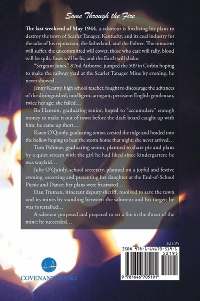 The last weekend of May 1944, a saboteur is finalizing his plans to destroy the town of Scarlet Tanager, Kentucky, and its coal industry for the sake of his reputation, the fatherland, and the Fuhrer. The innocent will suffer, the uncommitted will cower, those who care will rally, blood will be spilt, fuses will be lit, and the Earth will shake. "Sergeant Jones," 82nd Airborne, jumped the 509 in Corbin hoping to make the railway yard at the Scarlet Tanager Mine by evening; he never showed… Jenny Kearny, high school teacher, fought to discourage the advances of the distinguished, intelligent, arrogant, persistent English gentleman, twice her age; she failed… Bo Hanson, graduating senior, hoped to "accumulate" enough money to make it out of town before the draft board caught up with him; he came up short… Karen O'Quinly, graduating senior, crested the ridge and headed into the hollow hoping to beat the storm home that night; she never arrived… Tom Polimar, graduating senior, planned to share pie and plans by a quiet stream with the girl he had liked since kindergarten; he was waylaid… Julie O'Quinly, school secretary, planned on a joyful and festive evening, escorting and presenting her daughter at the End-of-School Picnic and Dance; her plans were frustrated… Dan Truman, itinerant deputy sheriff, resolved to save the town and its mines by standing between the saboteur and his target; he was forestalled… A saboteur purposed and prepared to set a fire in the throat of the mine; he succeeded…