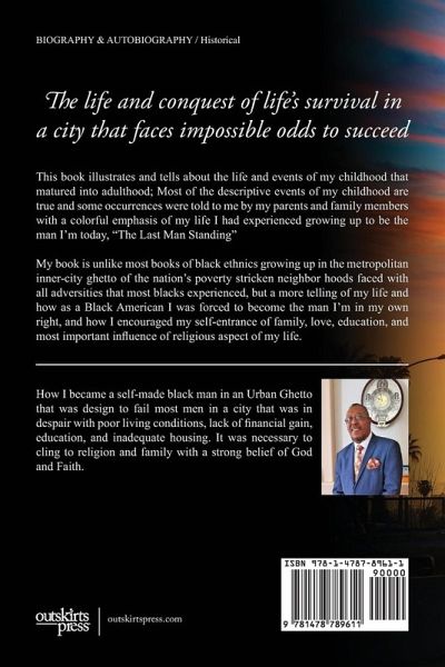 This book illustrates and tells about the life and events of my childhood that matured into adulthood. Most of the descriptive events of my childhood are true and some occurrences were told to me by my parents and family members with a colorful emphasis of my life I had experienced growing up to be the man I'm today, "The Last Man Standing" My book is unlike most books of black ethnics growing up in the metropolitan inner-city ghetto of the nation's poverty stricken neighbor hoods faced with all adversities that most blacks experienced, but a more telling of my life and how as a Black American I was forced to become the man I'm in my own right, and how I encouraged my self-entrance of family, love, education, and most important influence of religious aspect of my life.