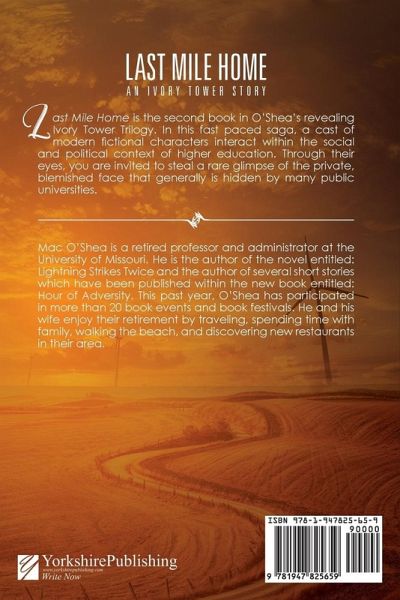 Last Mile Home is the second book in O’Shea’s revealing Ivory Tower Trilogy. In this fast paced saga, a cast of modern fictional characters interact within the social and political context of higher education. Through their eyes, you are invited to steal a rare glimpse of the private, blemished face that generally is hidden by many public universities.