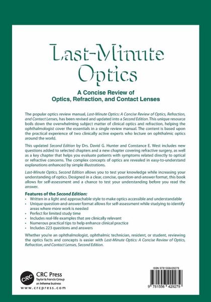 DedicationFigure ListTable List Acknowledgments About the AuthorsIntroduction to the First EditionIntroduction to the Second Edition Section 1. Basic Principles Section 2. Vergence, Lenses, Objects, and Images Section 3. The Model Eye Section 4. Visual Acuity Testing Section 5. Refraction and Optical Dispensing Section 6. Lens Effectivity and Vertex Distance Section 7. Accommodation, Presbyopia, and Bifocals Section 8. Astigmatism Section 9. Aberrations, Distortions, and Irregularities Section 10. Contact Lenses Section 11. Intraocular Lenses Section 12. Refractive Surgery Section 13. Magnification and Telescopes Section 14. Low Vision Section 15. Mirrors Section 16. Prisms and Diplopia Section 17. Instruments Section 18. Good People, Bad Optics: The Dissatisfied Patient Section 19. Important Formulas Index