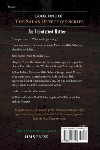 An identified killer ... A simple arrest . . . What could go wrong? It was supposed to be a routine arrest. Detective Mike Salas has identified the killer . . . Salas knows where the killer is . . . His plan: Arrest the suspect before he strikes again. His problem: One million bikers at the 75th Annual Sturgis Motorcycle Rally. Follow Indiana Detective Mike Salas to Sturgis, South Dakota as he tracks down a serial murderer. Ride the Black Hills, experience Mount Rushmore, the Chip, Da Bus and downtown Sturgis while the killer stalks his next victim. Be there when the killer strikes. Will he make his kill? Will Salas stop him? Will it be the last night in Sturgis?