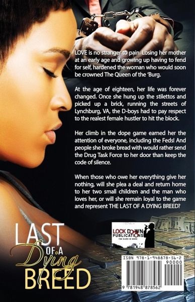 LOVE is no stranger to pain. Losing her mother at an early age and growing up having to fend for self, hardened the woman who would soon be crowned The Queen of the 'Burg. At the age of eighteen, her life was forever changed. Once she hung up the stilettos and picked up a brick, running the streets of Lynchburg, VA, the D-boys had to pay respect to the realest female hustler to hit the block. Her climb in the dope game earned her the attention of everyone, including the Feds! And people she broke bread with would rather send the Drug Task Force to her door than keep the code of silence. When those who owe her everything give her nothing, will she plea a deal and return home to her two small children and the man who loves her, or will she remain loyal to the game and represent the LAST OF A DYING BREED?