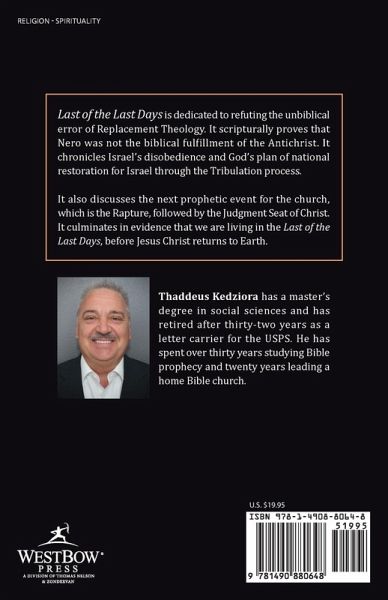 Last of the Last Days is dedicated to refuting the unbiblical error of Replacement Theology. It scripturally proves that Nero was not the biblical fulfillment of the Antichrist. It chronicles Israel's disobedience and God's plan of national restoration for Israel through the Tribulation process. It also discusses the next prophetic event for the church, which is the Rapture, followed by the Judgment Seat of Christ. It culminates in evidence that we are living in the Last of the Last Days, before Jesus Christ returns to Earth.