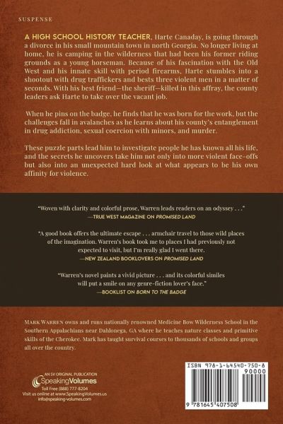 Award-winning writer of Wyatt Earp, An American Odyssey, winner of the 2020 Will Rogers Medallion Award, a 2019 Spur Award Finalist and an "Editor's Choice" by The Historical Novel Society A high school history teacher, Harte Canaday, is going through a divorce in his small mountain town in north Georgia. No longer living at home, he is camping in the wilderness that had been his former riding grounds as a young horseman. Because of his fascination with the Old West and his innate skill with period firearms, Harte stumbles into a shootout with drug traffickers and bests three violent men in a matter of seconds. With his best friend-the sheriff-killed in this affray, the county leaders ask Harte to take over the vacant job.When he pins on the badge, he finds that he was born for the work, but the challenges fall in avalanches as he learns about his county's entanglement in drug addiction, sexual coercion with minors, and murder.These puzzle parts lead him to investigate people he has known all his life, and the secrets he uncovers take him not only into more violent face-offs but also into an unexpected hard look at what appears to be his own affinity for violence. Praise for Mark Warren"Woven with clarity and colorful prose, Warren leads readers on an odyssey . . ." -True West Magazine on Promised Land "A good book offers the ultimate escape . . . armchair travel to those wild places of the imagination. Warren's book took me to places I had previously not expected to visit, but I'm really glad I went there. -New Zealand Booklovers on Promised Land "Warren's novel paints a vivid picture . . . and its colorful similes will put a smile on any genre-fiction lover's face." -Booklist on Born to the Badge