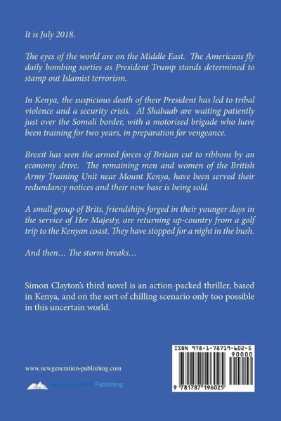 It is July 2018. The eyes of the world are on the Middle East. The Americans fly daily bombing sorties as President Trump stands determined to stamp out Islamist terrorism. In Kenya, the suspicious death of their President has led to tribal violence and a security crisis. Al Shabaab are waiting patiently just over the Somali border, with a motorised brigade who have been training for two years, in preparation for vengeance. Brexit has seen the armed forces of Britain cut to ribbons by an economy drive. The remaining men and women of the British Army Training Unit near Mount Kenya, have been served their redundancy notices and their new base is being sold. A small group of Brits, friendships forged in their younger days in the service of Her Majesty, are returning up-country from a golf trip to the Kenyan coast. They have stopped for a night in the bush. And then… The storm breaks… Simon Clayton's third novel is an action-packed thriller, based in Kenya, and on the sort of chilling scenario only too possible in this uncertain world.
