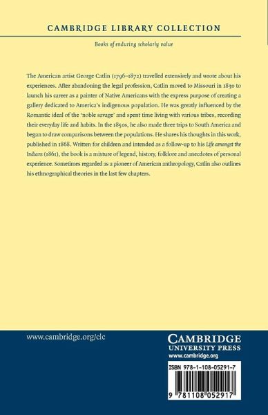 The American artist George Catlin (1796-1872) travelled extensively and wrote about his experiences. After abandoning the legal profession, Catlin moved to Missouri in 1830 to launch his career as a painter of Native Americans with the express purpose of creating a gallery dedicated to America's indigenous population. He was greatly influenced by the Romantic ideal of the 'noble savage' and spent time living with various tribes, recording their everyday life and habits. In the 1850s, he also made three trips to South America and began to draw comparisons between the populations. He shares his thoughts in this work, published in 1868. Written for children and intended as a follow-up to his Life amongst the Indians (1861), the book is a mixture of legend, history, folklore and anecdotes of personal experience. Sometimes regarded as a pioneer of American anthropology, Catlin also outlines his ethnographical theories in the last few chapters.