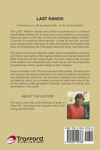 The LAST RANCH shares the author's experience of a family's concentrated efforts to try to bring back to life a splendid historical ranch in the hills of the south Okanagan Valley of British Columbia. An additional hand was their 12 year old son Eric, who had grown experienced in the ways of cattle and isolation during their three years of homesteading life in the Upper Squamish Valley, near Vancouver. This bold and energy-intensive cattle ranch undertaking coincided with the ten year period of the highest inflation and interest rates which North America has ever experienced. This fact undercut the success of the project in an unexpected way. Impacting as well was the growth of bureaucracy which caused ongoing delays of their progress. Known commonly in the 1970's as those 'back to the landers', the author and her husband had earlier known city lives of university educations and professional directions. Her husband's interests were devoted to Architecture which he put aside to pursue an alternative way of life. The author also offers an updated examination of the ongoing loss of British Columbia ranches and the reasons behind these changes.