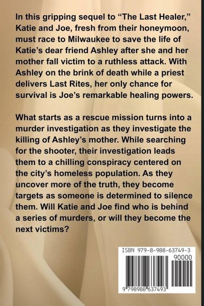 In this gripping sequel to "The Last Healer," Katie and Joe, fresh from their honeymoon, must race to Milwaukee to save the life of Katie's dear friend Ashley after she and her mother fall victim to a ruthless attack. With Ashley on the brink of death while a priest delivers Last Rites, her only chance for survival is Joe's remarkable healing powers. What starts as a rescue mission turns into a murder investigation as they investigate the killing of Ashley's mother. While searching for the shooter, their investigation leads them to a chilling conspiracy centered on the city's homeless population. As they uncover more of the truth, they become targets as someone is determined to silence them. Will Katie and Joe find who is behind a series of murders, or will they become the next victims?