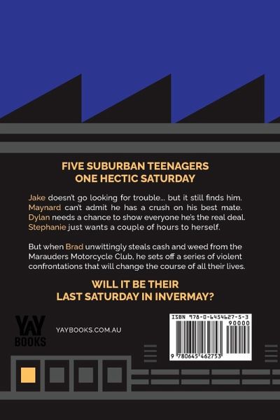 FIVE SUBURBAN TEENAGERS. ONE HECTIC SATURDAY. Jake doesn't go looking for trouble, but still finds it. Maynard realises that he is attracted to his best mate. Dylan needs a chance to show everyone he's the real deal. Stephanie just wants a couple of hours to herself. But when Brad unwittingly steals cash and weed from the Marauders Motorcycle Club, he sets off a series of violent confrontations that will change the course of all their lives. Will it be their Last Saturday in Invermay?