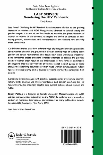 Following a decade in which the focus on HIV and AIDS has been on specific social groups, a shift in professional perceptions has resulted in a change in the images of women and HIV/AIDS. "Last Served?" recognizes and analyzes the trend toward more openly acknowledging and planning for women in the pandemic. Rather than enumerating the effects on women of confused or conflicting policies and representation, the book details why and how this situation occurred.; The author suggests that new visibility of women cannot in itself quickly or easily change the underlying assumptions which made women simultaneously radiant figures of sexual purity, and a magnet for blame during the pandemic's first decade.; "Last Served?" makes clear how the different ways of posing and answering questions about women and HIV are grounded in already existing ways of thinking about gender, and how these underlying preconceptions sometimes create situations whereby attempts to address the practical needs of women often result in reinforcement, or introduction of new forms of male domination.; Combining detailed analysis with practical suggestions, "Last Served?" provides insights into the current debates about women and AIDS and suggests future directions for work to overcome discrimination, faulty planning and misrepresentation.