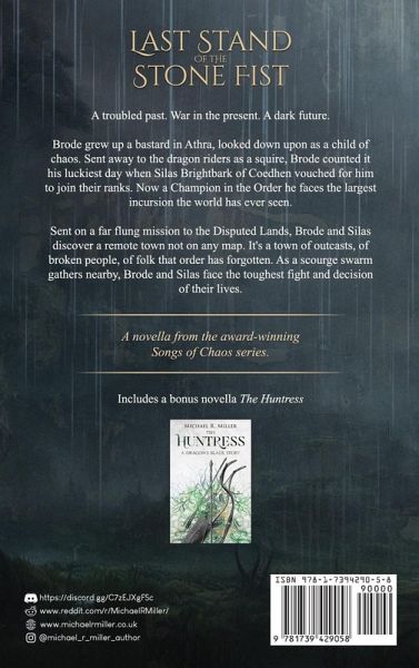 A troubled past. War in the present. A dark future. Brode grew up a bastard in Athra, looked down upon as a child of chaos. Sent away to the dragon riders as a squire, Brode counted it his luckiest day when Silas Brightbark of Coedhen vouched for him to join their ranks. Now a Champion in the Order he faces the largest incursion the world has ever seen. Sent on a far flung mission to the Disputed Lands, Brode and Silas discover a remote town not on any map. It's a town of outcasts, of broken people, of folk that order has forgotten. As a scourge swarm gathers nearby, Brode and Silas face the toughest fight and decision of their lives. This print edition also includes a bonus second novella called The Huntress set in the world of my first trilogy, The Dragon's Blade. There are also map images of both series, as well some concept sketches for The Dragon's Blade.