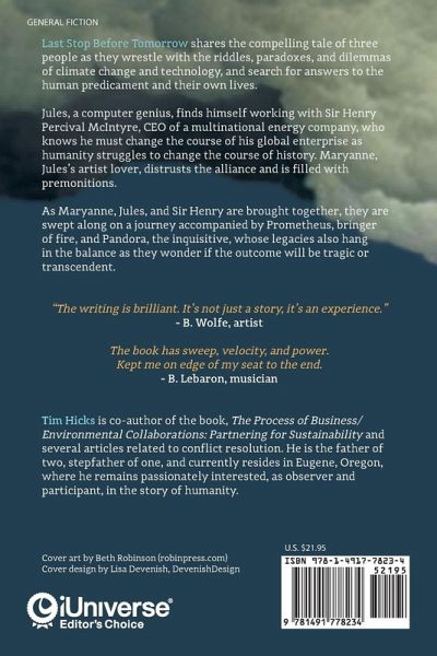 Last Stop Before Tomorrow shares the compelling tale of three people as they wrestle with the riddles, paradoxes, and dilemmas of climate change and technology, and search for answers to the human predicament and their own lives. Jules, a computer genius, finds himself working with Sir Henry Percival McIntyre, CEO of a multinational energy company, who knows he must change the course of his global enterprise as humanity struggles to change the course of history. Maryanne, Jules's artist lover, distrusts the alliance and is filled with premonitions. As Maryanne, Jules, and Sir Henry are brought together, they are swept along on a journey accompanied by Prometheus, bringer of fire, and Pandora, the inquisitive, whose legacies also hang in the balance as they wonder if the outcome will be tragic or transcendent. "The writing is brilliant. It's not just a story, it's an experience." - B. Wolfe, artist The book has sweep, velocity, and power. Kept me on edge of my seat to the end. - B. Lebaron, musician