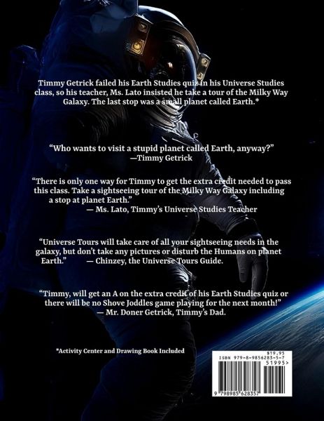 When Timmy Getrick fails an Earth Studies quiz in his Universe Studies class there is only one way to get the extra credit he needs to pass. He has to go on a sightseeing tour of the Milky Way Galaxy and the last stop on the tour is a planet called Earth. Come with Timmy as he explores his UFO, meets new and exciting creatures, plays his favorite robot game pieces, all while learning about Human Beings that inhabit a placed called Earth. This science fiction, space adventure is a one of a kind narrative from a space alien's point of view. This children's book interior is in full-color pictures, and also includes an activity center full of of questions, drawings, and coloring pages. Ride along with Timmy as he explores his spaceship, meets new and exciting creatures, plays with his favorite robot game pieces, Shove Joddles, all while learning about Human Beings that inhabit a planet called Earth. Please come join Timmy on his adventurizing of the Milky Way Galaxy, Earth, and Human Beings.