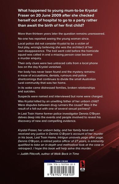 What happened to young mum-to-be Krystal Fraser on 20 June 2009 after she checked herself out of hospital to go to a party rather than await the birth of her first child? More than thirteen years later the question remains unanswered. No-one has reported seeing the young woman since. Local police did not consider Krystal to be a victim of foul play, wrongly believing she was the architect of her own disappearance. The trail went cold before the homicide squad was called in and a missing person case became a murder enquiry. Their only clues were two untraced calls from a local phone box on the day Krystal vanished. Her body has never been found and the mystery remains: a maze of accusations, denials, rumours and police shortcomings that continues to divide the small Australian rural community that was her home. In its wake came distressed families, broken relationships and suicides. Suspects were named and interviewed but none were charged. Was Krystal killed by an unwilling father of her unborn child? Were disputes between drug runners the cause? Was it the result of a fall-out with one of several sexual partners? In Last Train Home former police investigator Dennis O'Bryan delves deep into the events and people involved to reveal his discovery of new and compelling evidence.