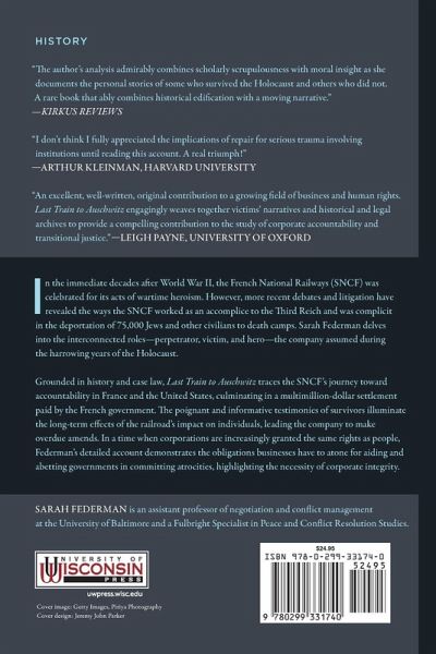 In the immediate decades after World War II, the French National Railways (SNCF) was celebrated for its acts of wartime heroism. However, recent debates and litigation have revealed the ways the SNCF worked as an accomplice to the Third Reich and was actively complicit in the deportation of 75,000 Jews and other civilians to death camps. Sarah Federman delves into the interconnected roles-perpetrator, victim, and hero-the company took on during the harrowing years of the Holocaust. Grounded in history and case law, Last Train to Auschwitz traces the SNCF's journey toward accountability in France and the United States, culminating in a multimillion-dollar settlement paid by the French government on behalf of the railways.The poignant and informative testimonies of survivors illuminate the long-term effects of the railroad's impact on individuals, leading the company to make overdue amends. In a time when corporations are increasingly granted the same rights as people, Federman's detailed account demonstrates the obligations businesses have to atone for aiding and abetting governments in committing atrocities. This volume highlights the necessity of corporate integrity and will be essential reading for those called to engage in the difficult work of responding to past harms.