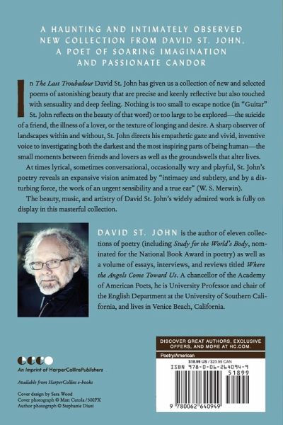 A haunting and intimately observed new collection from David St. John, a poet of soaring imagination and passionate candor In The Last Troubadour, David St. John has given us a collection of new and selected poems of astonishing beauty, precise and keenly observed but also touched with sensuality and deep feeling. Nothing is too small to escape notice (in "Guitar" St. John reflects on the beauty of that word) or too large to be explored-the suicide of a friend, the illness of a lover, or the texture of longing and desire. A sharp observer of landscapes within and without, St. John directs his empathetic gaze and vivid, inventive voice to investigating both the darkest and the most inspiring parts of being human, the small moments between friends and lovers as well as the groundswells that alter lives. At times lyrical, sometimes conversational, occasionally wry and playful, St. John's poetry reveals an expansive vision animated by "intimacy and subtlety, and by a disturbing force, the work of an urgent sensibility and a true ear." (W.S. Merwin) The beauty, music, and artistry of David St. John's widely admired work is fully on display in this masterful collection.