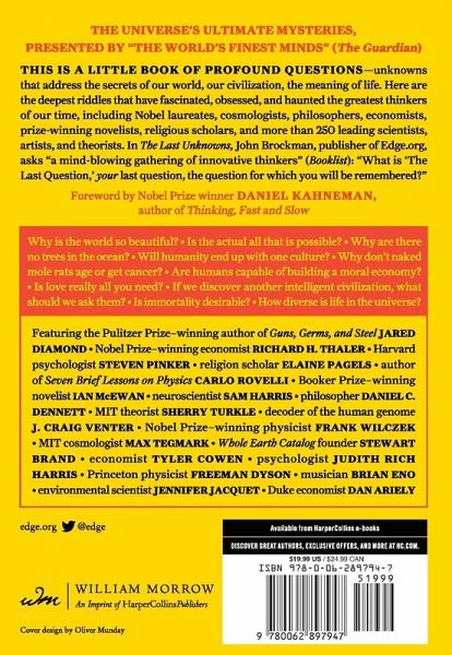 Every scientist has his or her "ultimate question," the unknown quantity that, if answered, would break open their field. In the spirit of this, Edge.org publisher John Brockman asks 284 of the world's leading scientists, academics, artists, and intellectuals: "What is the last question?" Contributors include: Jared Diamond: "Why is there such widespread public opposition to science and scientific reasoning in the United States, the world leader in every major branch of science?"Steven Pinker: "How can we empower the better angels of our nature?"Carlo Rovelli: "Is there an ultimate reality?"Nina Jablonski: "When will race disappear?"Kevin Kelly: "How can the process of science be improved?"Andrei Linde: "Where were the laws of physics written before the universe was born?"Mario Livio: "Will it ever be possible to download the information stored in the human brain?"Ian McEwan: "If the sum of all significant knowledge is finite, what proportion of it can humans, aided by intelligent machines, eventually attain?"George Dyson: "Why are there no trees in the ocean?"Dylan Evans: "Will civilization collapse before I die?"And many, many others