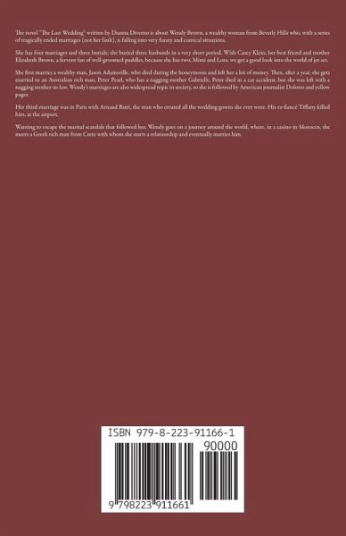 The novel "The Last Wedding" written by Dianna Diverno is about Wendy Brown, a wealthy woman from Beverly Hills who, with a series of tragically ended marriages (not her fault), is falling into very funny and comical situations. She has four marriages and three burials; she buried three husbands in a very short period. With Casey Klein, her best friend and mother Elizabeth Brown, a fervent fan of well-groomed puddles, because she has two, Mimi and Lora, we get a good look into the world of jet set. She first marries a wealthy man, Jason Adamsville, who died during the honeymoon and left her a lot of money. Then, after a year, she gets married to an Australian rich man, Peter Pearl, who has a nagging mother Gabrielle. Peter died in a car accident, but she was left with a nagging mother-in-law. Wendy's marriages are also widespread topic in society, so she is followed by American journalist Dolores and yellow pages. Her third marriage was in Paris with Arnaud Batri, the man who created all the wedding gowns she ever wore. His ex-fiancé Tiffany killed him, at the airport. Wanting to escape the marital scandals that followed her, Wendy goes on a journey around the world, where, in a casino in Morocco, she meets a Greek rich man from Crete with whom she starts a relationship and eventually marries him.