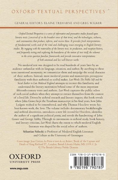 No medieval text was designed to be read hundreds of years later by an audience unfamiliar with its language, situation, and author. By ascribing to these texts intentional anonymity, we romanticise them and misjudge the social character of their authors. Instead, most medieval poems and manuscripts presuppose familiarity with their authorial or scribal maker. Last Words: The Public Self and the Social Author in Late Medieval England attempts to recover this familiarity and understand the literary motivation behind some of most important fifteenth-century texts and authors. Last Words captures the public selves of such social authors when they attempt to extract themselves from the context of a lived life. Driven by archival research and literary inquiry, this book reveals where John Gower kept the Trentham manuscript in his final years, how John Lydgate wished to be remembered, and why Thomas Hoccleve wrote his best-known work, the Series. It includes documentary breakthroughs and archival discoveries, and introduces a new life record for Hoccleve, identifies the author of a significant political poem, and reveals the handwriting of John Gower and George Ashby. Through its investments in archival study, book history, and literary criticism, Last Words charts the extent to which medieval English literature was shaped by the social selves of their authors.
