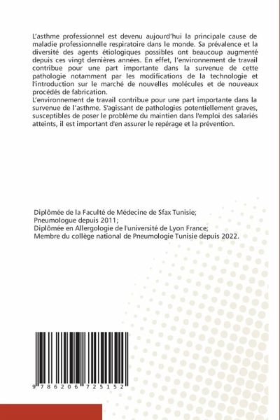 L'asthme professionnel est devenu aujourd'hui la principale cause de maladie professionnelle respiratoire dans le monde. Sa prévalence et la diversité des agents étiologiques possibles ont beaucoup augmenté depuis ces vingt dernières années. En effet, l'environnement de travail contribue pour une part importante dans la survenue de cette pathologie notamment par les modifications de la technologie et l'introduction sur le marché de nouvelles molécules et de nouveaux procédés de fabrication.L'environnement de travail contribue pour une part importante dans la survenue de l'asthme. S'agissant de pathologies potentiellement graves, susceptibles de poser le problème du maintien dans l'emploi des salariés atteints, il est important d'en assurer le repérage et la prévention.