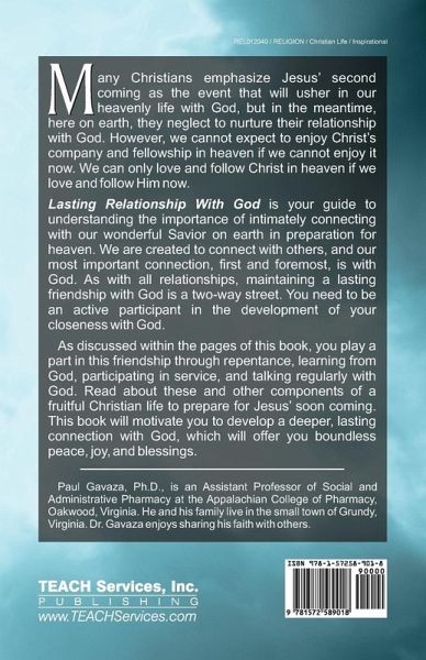 Many Christians emphasize Jesus' second coming as the event that will usher in our heavenly life with God, but in the meantime, here on earth, they neglect to nurture their relationship with God. However, we cannot expect to enjoy Christ's company and fellowship in heaven if we cannot enjoy it now. We can only love and follow Christ in heaven if we love and follow Him now. "Lasting Relationship With God" is your guide to understanding the importance of intimately connecting with our wonderful Savior on earth in preparation for heaven. We are created to connect with others, and our most important connection, first and foremost, is with God. As with all relationships, maintaining a lasting friendship with God is a two-way street. You need to be an active participant in the development of your closeness with God. As discussed within the pages of this book, you play a part in this friendship through repentance, learning from God, participating in service, and talking regularly with God. Read about these and other components of a fruitful Christian life to prepare for Jesus' soon coming. This book will motivate you to develop a deeper, lasting connection with God, which will offer you boundless peace, joy, and blessings.