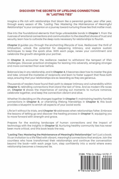 Discover the Secrets of Lifelong Connections in "Lasting Ties" Imagine a life rich with relationships that bloom like a perennial garden, year after year, through every season of life. "Lasting Ties: Mastering the Maintenance of Meaningful Relationships" is your companion on a journey toward nurturing those ties that matter most. Dive into the foundational elements that forge unbreakable bonds in Chapter 1. From the nuances of emotional connections and communication to the steadfast shores of trust and security, learn how to cultivate the deep roots necessary for relationships to flourish. Chapter 2 guides you through the enchanting lifecycle of love. Rediscover the thrill of infatuation, unlock the potential for deepening intimacy, and explore sustain techniques to keep the spark alive. With each page, renew your commitment and celebrate the growth alongside your partner. In Chapter 3, encounter the resilience needed to withstand the tempest of life's challenges. Discover practical strategies for leaning into adversity, emerging stronger and more connected than ever before. Balance is key in any relationship, and in Chapter 4, it becomes clear how to master the give and take. Unravel the mysteries of reciprocity and learn to foster support that flows both ways, ensuring that your relationships are as rewarding as they are generous. Thousands of readers have found their path to deeper intimacy and vulnerability within Chapter 5, rekindling connections that stand the test of time. And as modern life races on, Chapter 6 shows the importance of carving out moments to nurture romance, celebrate together, and keep the connection vibrant and alive. Whether it's deciding on life changes together in Chapter 7, maintaining healthy familial connections in Chapter 8, or cherishing lifelong friendships in Chapter 9, this book provides a blueprint to enrich all aspects of your social world. Life isn't without its trials, and Chapter 10 addresses when relationships falter. Embrace the lessons of letting go and discover the healing process in Chapter 11, equipping you to move forward with strength and grace. Prepare for the evolving landscape of human connections and the impact of technology with the insights in Chapter 12. Nurturing healthy community ties has never been more critical, and this book leads the way. "Lasting Ties: Mastering the Maintenance of Meaningful Relationships" isn't just a book; it's an invitation to a life filled with vibrant, meaningful connections that endure. Join the countless who have transformed their relationships and continue the conversation beyond the book-with each page turn, step confidently into a world where every relationship becomes a treasured tie.