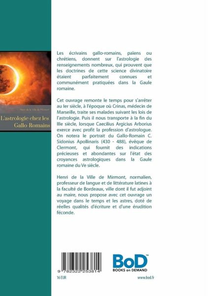 Les écrivains gallo-romains, païens ou chrétiens, donnent sur l'astrologie des renseignements nombreux, qui prouvent que les doctrines de cette science divinatoire étaient parfaitement connues et communément pratiquées dans la Gaule romaine.Cet ouvrage remonte le temps pour s'arrêter au Ier siècle, à l'époque où Crinas, médecin de Marseille, traite ses malades suivant les lois de l'astrologie. Puis il nous transporte à la fin du IIIe siècle, lorsque Caecilius Argicius Arborius exerce avec profit la profession d'astrologue. On notera le portrait du Gallo-Romain C. Sidonius Apollinaris (430 - 488), évêque de Clermont, qui fournit des indications précieuses et abondantes sur l'état des croyances astrologiques dans la Gaule romaine du Ve siècle.Henri de la Ville de Mirmont, normalien, professeur de langue et de littérature latines à la faculté de Bordeaux, ville dont il fut adjoint au maire, nous propose avec cet ouvrage un voyage dans le temps et les astres, doté de réelles qualités d'écriture et d'une érudition féconde.