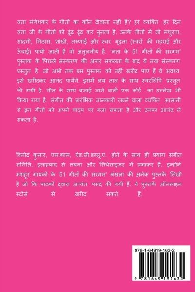 Lata Mangeshkar ke geeton ka kaun deewaana nahin hai? Har vyakti har din Lata ji ke geeton ko dhoondh dhoondh kar sunta hai. Unke geeton mein jo madhurta, saadgi, mithas, shokhi, tarunaai aur swar goodhta ( swaron ki gahraai aur unchaai ) paayi jaati hai vo atulneey hai. 'Lata ke 51 geeton ki sargam' pustak ke pichhle sanskaran ki apaar safalta ke baad ye naya sanskaran prastut hai. Jo abhi tak is pustak ko nahin khreed paaye hain ve avashya ise khareedkar aanand paayeinge. Ismein laya taal ke saath swarlipi prastut ki gayi hai. Geet ke saath bajaayi jaane wali ek chord ka ullekh bhi kiya gaya hai. Sangeet ki prarambhik jaankaari rakhne vala vyakti aasaani se in geeton ko apne vaady par bajaa sakta hai aur unka aanand le sakta hai.