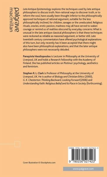 Late Antique Epistemology explores the techniques used by late antique philosophers to discuss truth. Non-rational ways to discover truth, or to reform the soul, have usually been thought inferior to the philosophically approved techniques of rational argument, suitable for the less philosophically inclined, for children, savages or the uneducated. Religious rituals, oracles, erotic passion, madness may all have served to waken courage or remind us of realities obscured by everyday concerns. What is unusual in the late antique classical philosophers is that these techniques were reckoned as reliable as reasoned argument, or better still. Late twentieth century commentators have offered psychological explanations of this turn, but only recently had it been accepted that there might also have been philosophical explanations, and that the later antique philosophers were not necessarily deluded.