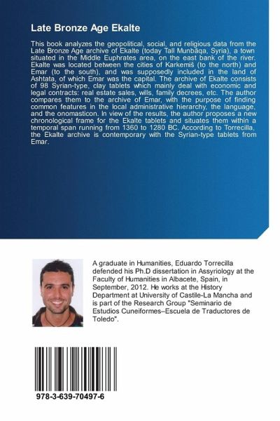 This book analyzes the geopolitical, social, and religious data from the Late Bronze Age archive of Ekalte (today Tall Munb qa, Syria), a town situated in the Middle Euphrates area, on the east bank of the river. Ekalte was located between the cities of Karkemis (to the north) and Emar (to the south), and was supposedly included in the land of Ashtata, of which Emar was the capital. The archive of Ekalte consists of 98 Syrian-type, clay tablets which mainly deal with economic and legal contracts: real estate sales, wills, family decrees, etc. The author compares them to the archive of Emar, with the purpose of finding common features in the local administrative hierarchy, the language, and the onomasticon. In view of the results, the author proposes a new chronological frame for the Ekalte tablets and situates them within a temporal span running from 1360 to 1280 BC. According to Torrecilla, the Ekalte archive is contemporary with the Syrian-type tablets from Emar.
