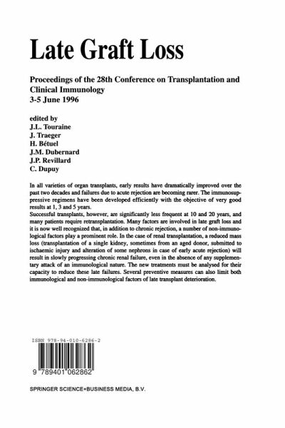 1. Chronic graft loss in kidney and heart transplant recipients.- 2. Histopathology of chronic rejection.- 3. Evaluation of biopsy changes in the early diagnosis of chronic transplant nephropathy.- 4. Is there any relationship between the early glomerular filtration rate and late graft dysfunction in renal transplantation?.- 5. Transplantation atherosclerosis: Definition and pathogenesis.- 6. Immunological mechanism of chronic rejection.- 7. The role of adhesion molecules in chronic rejection.- 8. A role for TH2 cells in chronic allograft rejection?.- 9. Treatment of refractory acute allograft rejection with aerosolized cyclosporin in lung transplant recipients.- 10. Ischemia-reperfusion injury as a risk factor for late kidney graft failure.- 11. The impact of acute rejection in the longterm outcome after renal transplantation.- 12. Nephron endowment and the pathogenesis of chronic renal failure.- 13. Are child donors better than adult donors for pediatric kidney recipients?.- 14. Late graft loss in combined kidney-pancreas transplantation.- 15. Longterm allograft outcome in patients treated with prophylactic antilymphocyte globulin or OKT3 as induction therapy in cadaveric kidney transplantation.- 16. Cyclosporin - longterm treatment.- 17. Effect of new immunosuppressive drugs on chronic rejection.- 18. Experimental transplantation in rats for the study of the pathogenesis and treatment of chronic rejection.- 19. The effects of HMG-CoA reductase inhibitors after kidney and heart transplantation: Lipid lowering and immunosuppression.- 20. Lipid metabolism alteration and treatment in heart transplant recipients.- 21. Prevention and treatment of cytomegalovirus (CMV) disease.- 22. Longterm renal function protection in renal transplantation by nonimmunological treatments.-Clinical impact and predictive role of OGTT as a marker of longterm loss of function in patients submitted to pancreas transplantation.- Influence of recipient - donor body weight ratio in pediatric renal transplantation.- Survival, rejection, tumors and infections 5 years after liver transplantation.- Comparison of dipyridamole thallium scintigraphy and dobutamine stress echocardiography to detect graft coronary artery disease in heart transplant patients.- Immunohistochemical profile in asymptomatic acute rejection of renal allografts: Predictive marker of graft loss.- High sodium UW cold-storage solution improves kidney graft function in rats.- Influence of natural selection haplotypes on longterm survival in renal transplantation from haploidentical living related donors.- Posttransplant immunological monitoring by ELISA: HLA-specific IgG antibodies are associated with early and late graft loss events.- Longterm benefit of additional azathioprine in cyclosporin/prednisolone-treated patients with chronic renal allograft dysfunction.- Effect of steroid withdrawal on late immunologic complications after liver transplantation.- Effect of angiotensin converting enzyme inhibitors (ACEI) on the progressive graft failure and proteinuria in kidney transplant patients with chronic rejection.- ATG prophylaxis preoperatively reduced acute rejections - a predicting factor on long graft survival.- Kidney transplantation in children at our center.- Kidney transplantation between spouses.- Oxidative stress and lipid abnormalities during chronic rejection of kidney transplantation.- Proton NMR spectroscopy as a novel approach to the assessment of function in the pig isolated kidney exposed to cold ischemia.- Renal handling of citrate excretion during reperfusion after cold storagein the isolated perfused pig kidney.- The improvement of early rat kidney graft function after perfusion with HTK solution supplemented with pentoxifylline.- Nifedipine improves kidney function after 24 h cold storage in a high-sodium UW solution.- Preventing cadaveric grafted kidney from acute rejection with anti-thymocyte globulin.- Study of the pharmacokinetics of the Neoral® formulation of cyclosporin in vivo.- One-year results of the European mycophenolate mofetil phase III in clinical trial in renal transplantation.- Detection of lymphocyte panel reactive antibody (PRA) use in kidney transplantation.- Cholestatic and HCV-related liver disease associated with acute rejection after liver transplantation.- Outcome of children and adolescents with recurrent nephrotic syndrome (NS) and focal segmental glomerulosclerosis (FSGS) after renal transplantation.- CD8+ T lymphocytes can amount to a second-set rejection of skin allografts in the absence of cytotoxic antibodies.- Hyperimmune globulin in the prevention of cytomegalovirus infection: Lack of efficacy in kidney graft recipients.- Lung and heart lung transplantation: Survival data concerning 100 transplants carried out in 95 patients at the L. Pradel University Hospital, Lyon.- Evolution of lipoprotein(a) and concentration 6 months after a successful renal transplantation.- GSTs: Sensitive and specific markers for liver transplant monitoring.- Is overweight a relevant risk factor in the short- and longterm evolution of renal transplantation?.- Renal allograft thrombosis (rat): A case-control study.- A prospective study on the effect of kidney transplantation (KT) and cyclosporin treatment on male sexual performance and hormonal profiles.- Iliac artery histology and renal allograft blood flow measured by Dopplerspectrum analysis.- Blood flow impairment in popliteal and posterior tibial arteries after iliac end-to-side anastomosed renal transplantation.- The first kidney transplantation from spouse in Lithuania.- Name Index.