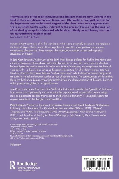 Fenves becomes one of the first to thoroughly explore Kant's later writings and give them the detailed scholarly attention they deserve. In his opening chapters, Fenves examines in detail the various essays in which Kant invents, formulates and complicates the thesis of "radical evil"--a thesis which serves as the point of departure for all his later writings. "Late Kant" then turns towards the counter-thesis of "radical mean-ness," which states that human beings exist on earth for the sake of another species or race of human beings. The consequences of this startling thesis are that human beings cannot claim possession of the earth, but must rather prepare the earth for its rightful owners.