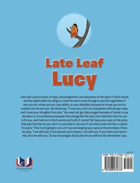 Late Leaf Lucy is a book of hope, encouragement, and assurance of the spirit of God's words and the depth which he will go to make his word come through in your life regardless of who you are, where you are, your ability, or your disability because he knows you and he created and formed you. His words say, "I know you, and I am acquainted with all your ways, and I know your thoughts from afar." You need not get discouraged because of doubt or any situation or circumstances because they change like the wind, but what God have for you is for you. Just hold on to God's words and truth; it cannot fail. Keep your eyes on the prize: that plan God has for you. Can't no one take it, not even if you have a twin brother or sister; it's yours." Time is not going to run out if you are keeping your eyes on the promises of God. He says, "I am with you. If you ascend up to heaven, I am with you. If you make your bed in hell, yet I am with you." So be encouraged; God's plan for you will not fail. Remember Lucy.
